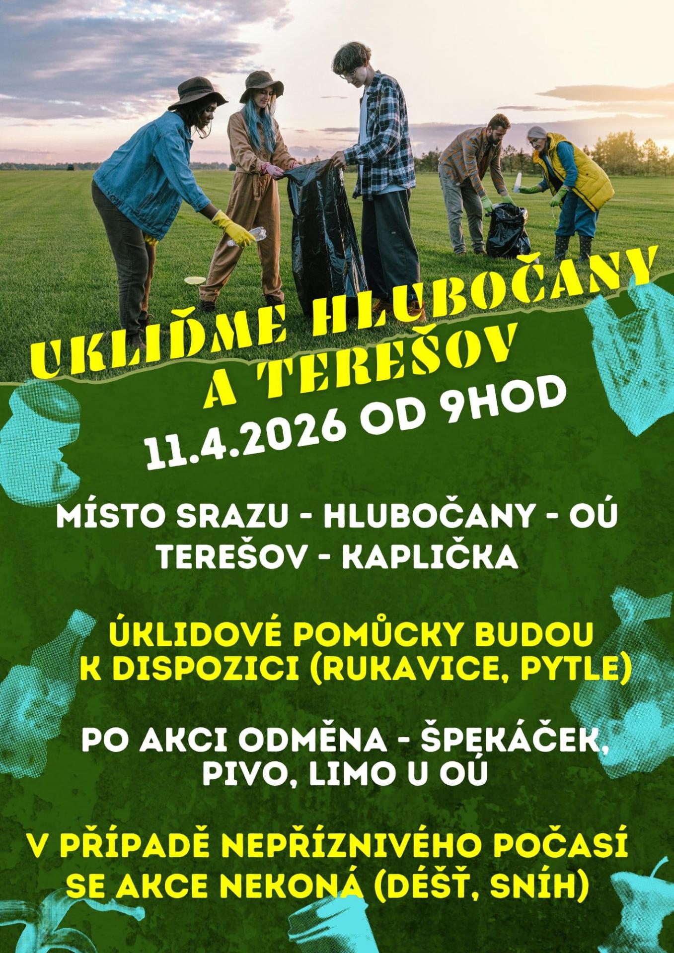 V sobotu 11.4.2026 se koná jarní úklidová akce Ukliďme Hlubočany a Terešov. Sraz dobrovolníků je v 9:00 u OÚ v Hlubočanech a v Terešově u kapličky. Úklidové pomůcky budou k dispozici na místě. V případě nepříznivého počasí se akce nekoná.