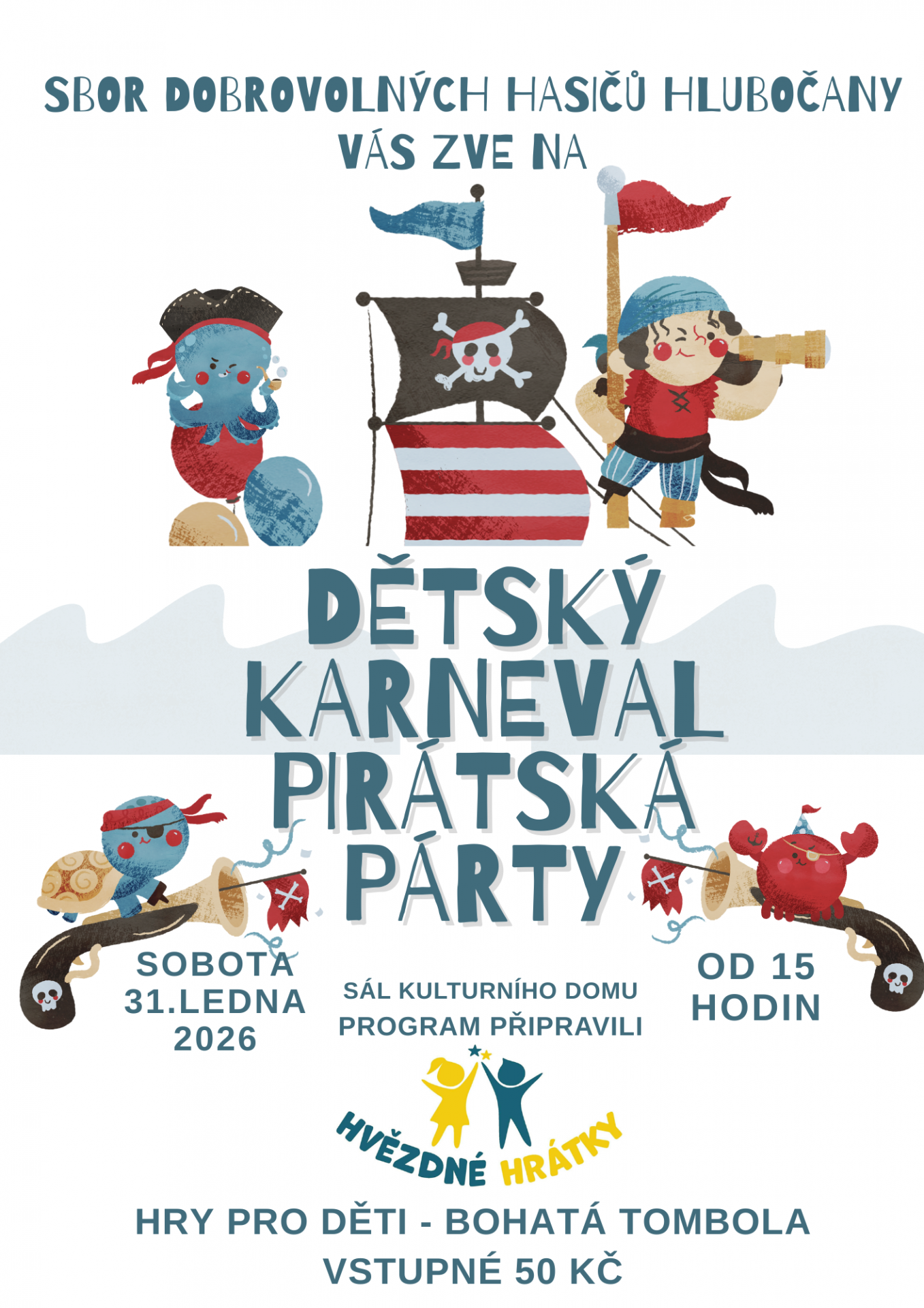 SDH Hlubočany pořádá v sobotu 31.1.2026 od 15:00 v sále KD Hlubočany DĚTSKÝ KARNEVAL - PIRÁTSKÁ PÁRTY. Vstupné 50 Kč, bohatá tombola.