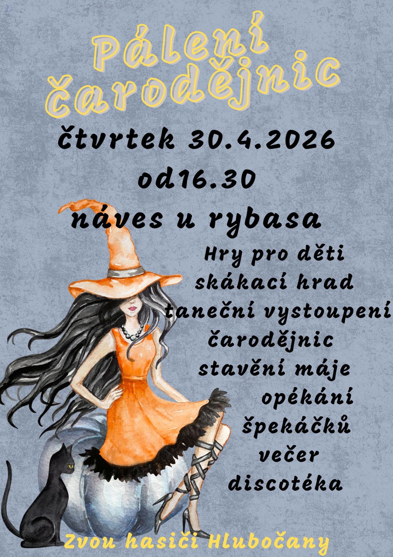 SDH Hlubočany pořádá ve čtvrtek 30.4.2026 od 16:30 pálení čarodějnic a stavění máje. Všichni jsou srdečně zváni. Akce se koná na návsi u rybníka.